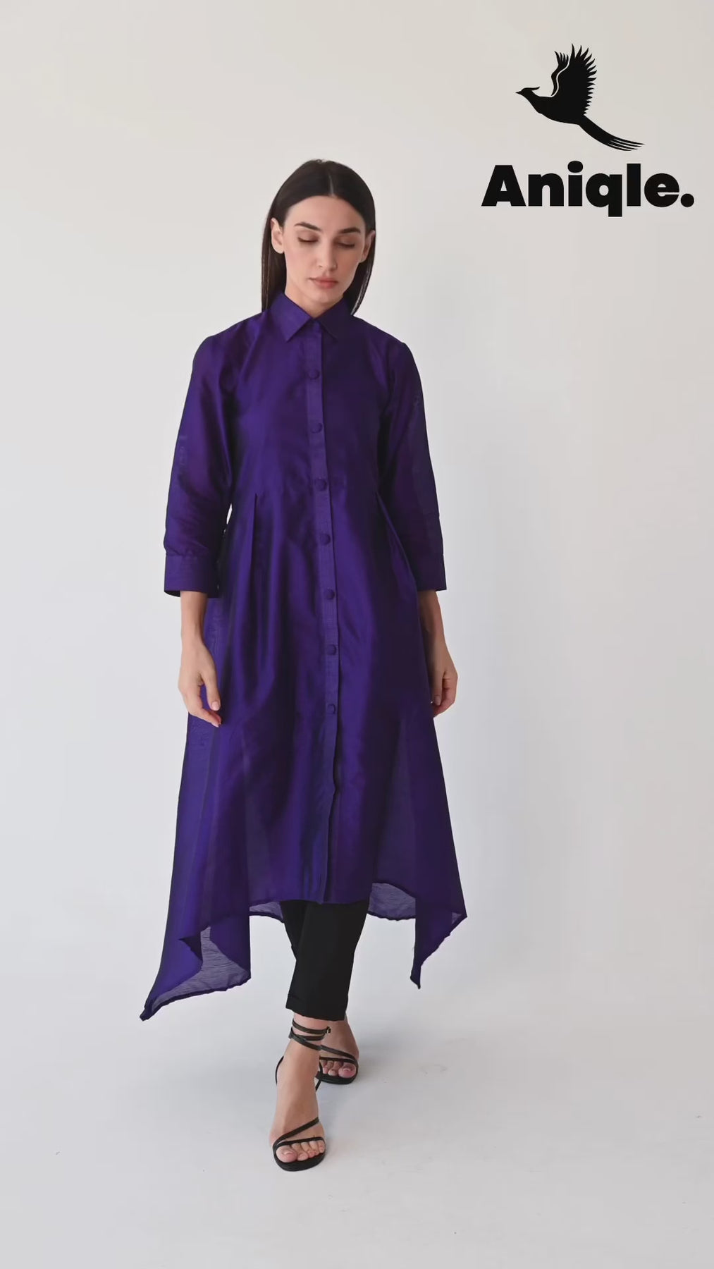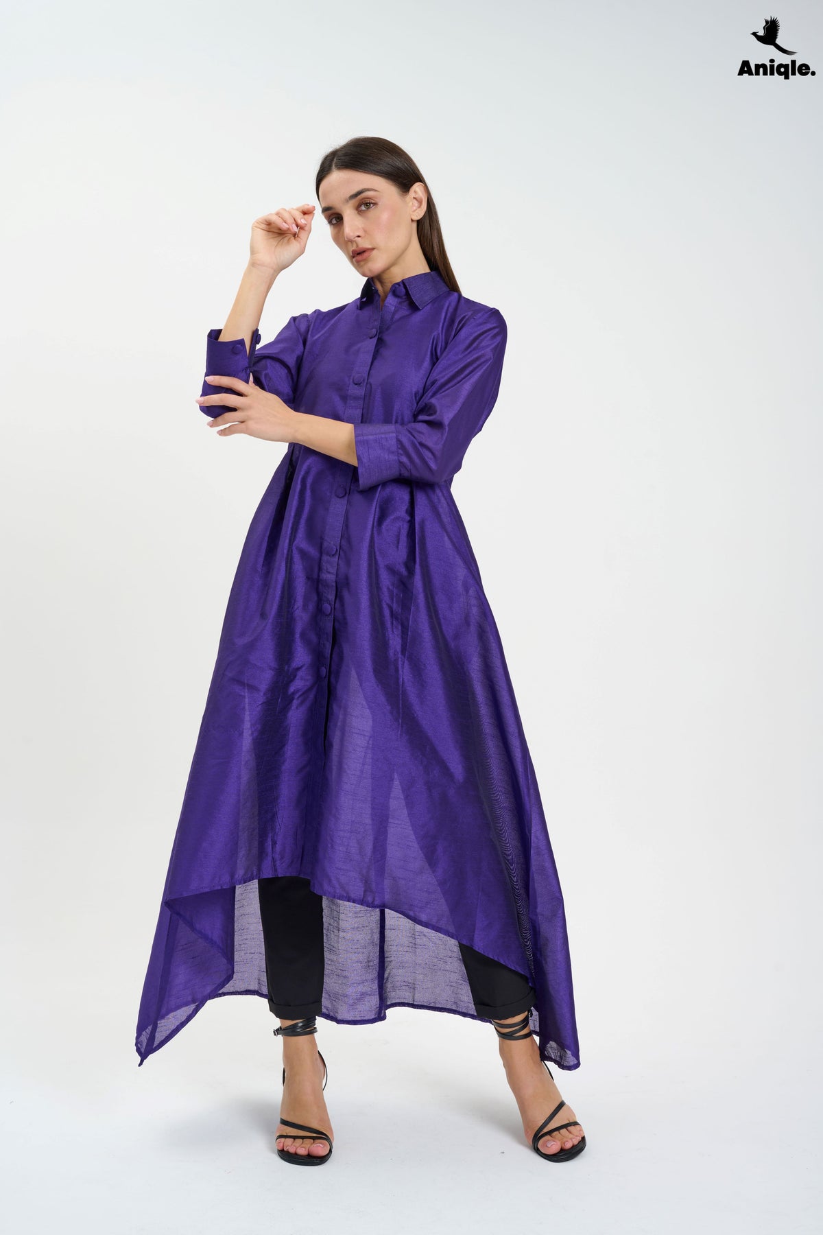This striking raw silk dress exudes luxury and elegance with its deep, rich purple hue and structured design. Featuring a classic shirt collar and a full button-down front, this dress combines traditional tailoring with the opulence of raw silk, giving it a polished yet vibrant appearance. The long, puffed sleeves add a dramatic flair, while the slightly flared, midi-length silhouette offers a flattering and graceful fit. Perfect for formal events or occasions where you want to make a statement, this dress blends timeless style with a bold, contemporary twist. The natural sheen of raw silk elevates its sophistication, making it an ideal choice for evening wear or special occasions.