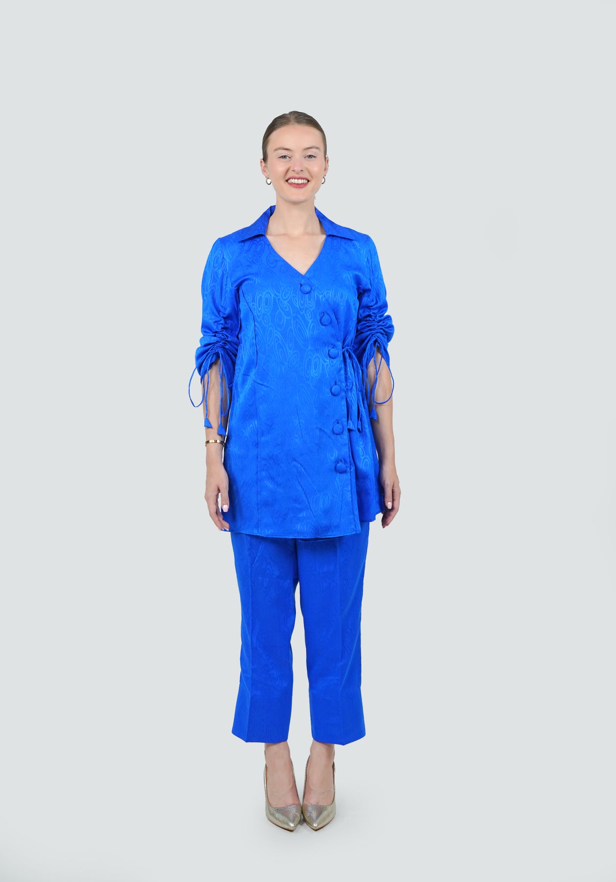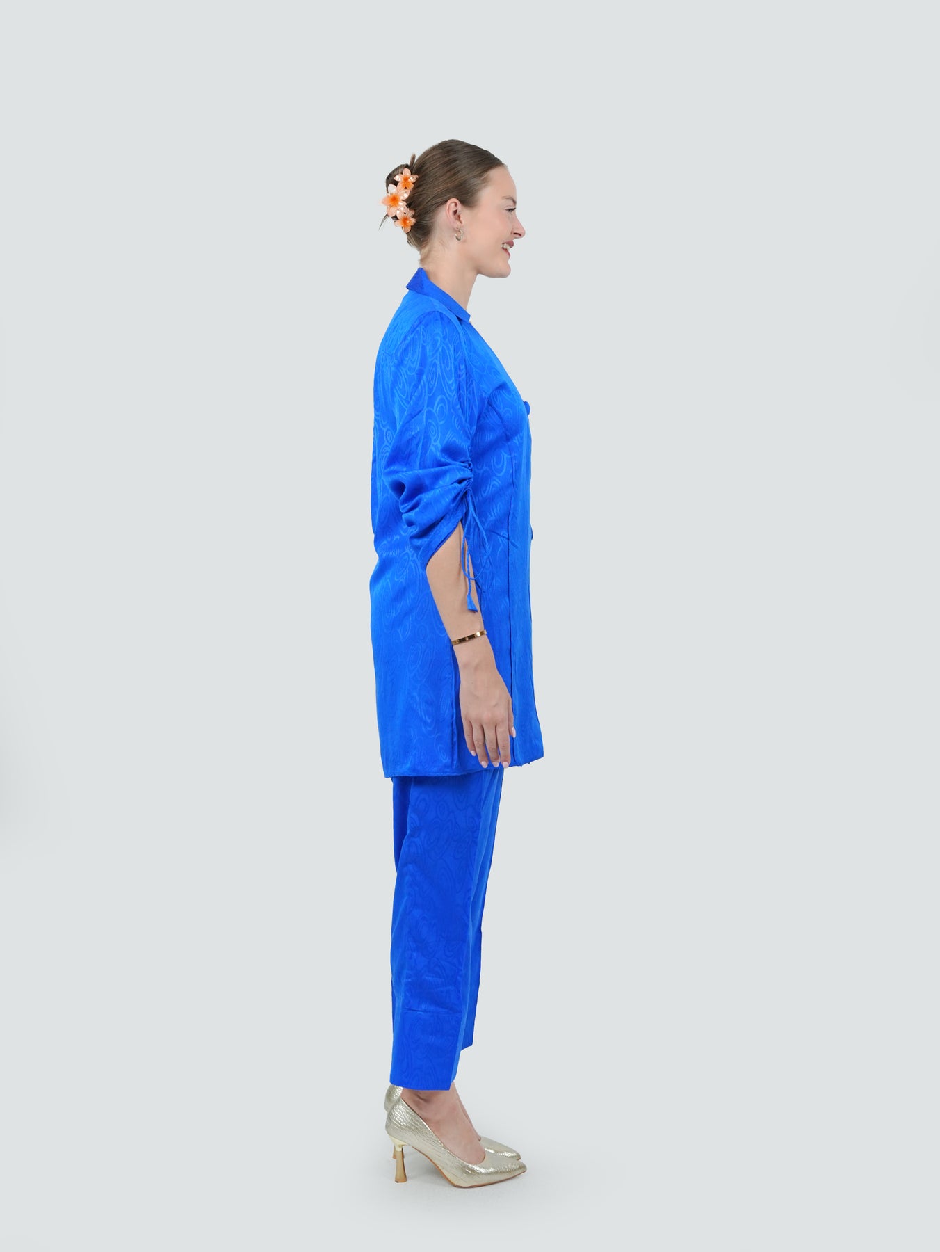 The Velora Cobalt Co-Ord Set by Aniqle is a bold and structured ensemble crafted in a vibrant blue jacquard fabric. The top features a sharp collar, side button detailing, and drawstring ruched sleeves that add a modern touch. Paired with cropped straight-leg pants, this set is perfect for power dressing with personality—ideal for luncheons, creative workdays, or confident casual wear.