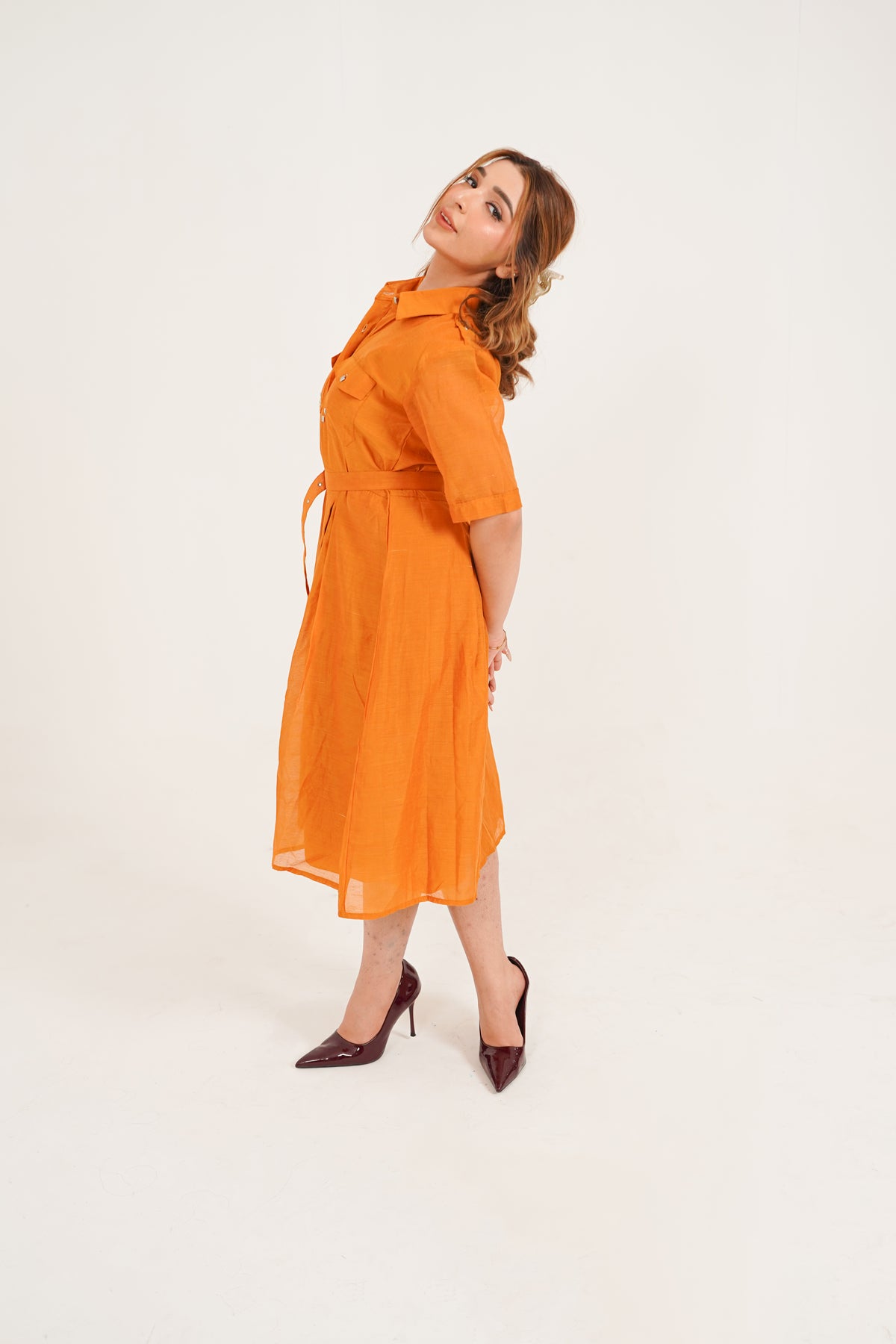 A refined Rust Reverie Midi Dress in a cotton noil twill–poly blend, featuring a concealed full front placket, stud-embellished bodice and pockets, kimono half sleeves, and a matching studded belt with box-pleated flare. Knee length; breathable texture; easy to style for weekday to weekend