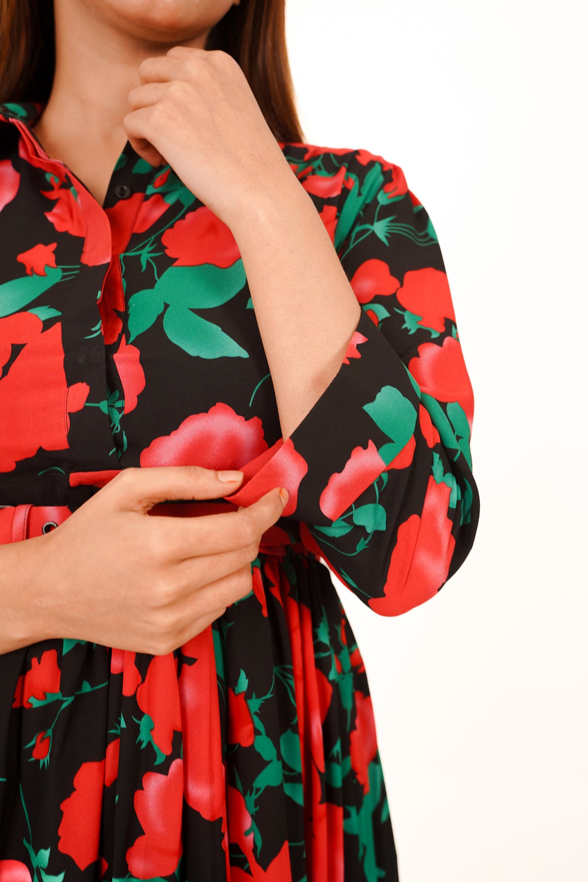 The Rosabella Bloom Maxi is crafted to elevate contemporary feminine style with a blend of sophistication and ease. Featuring a striking black base adorned with bold red and green florals, this maxi dress creates a visually rich profile suitable for both refined and relaxed settings.
