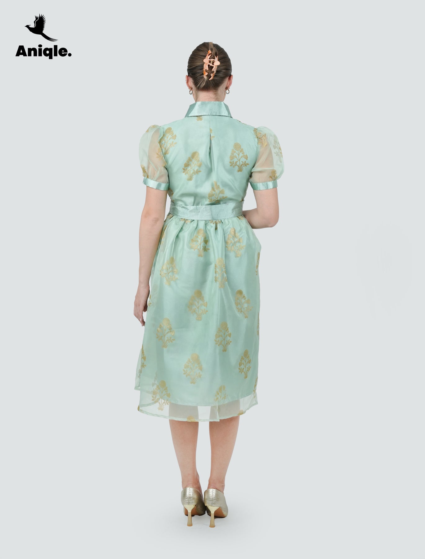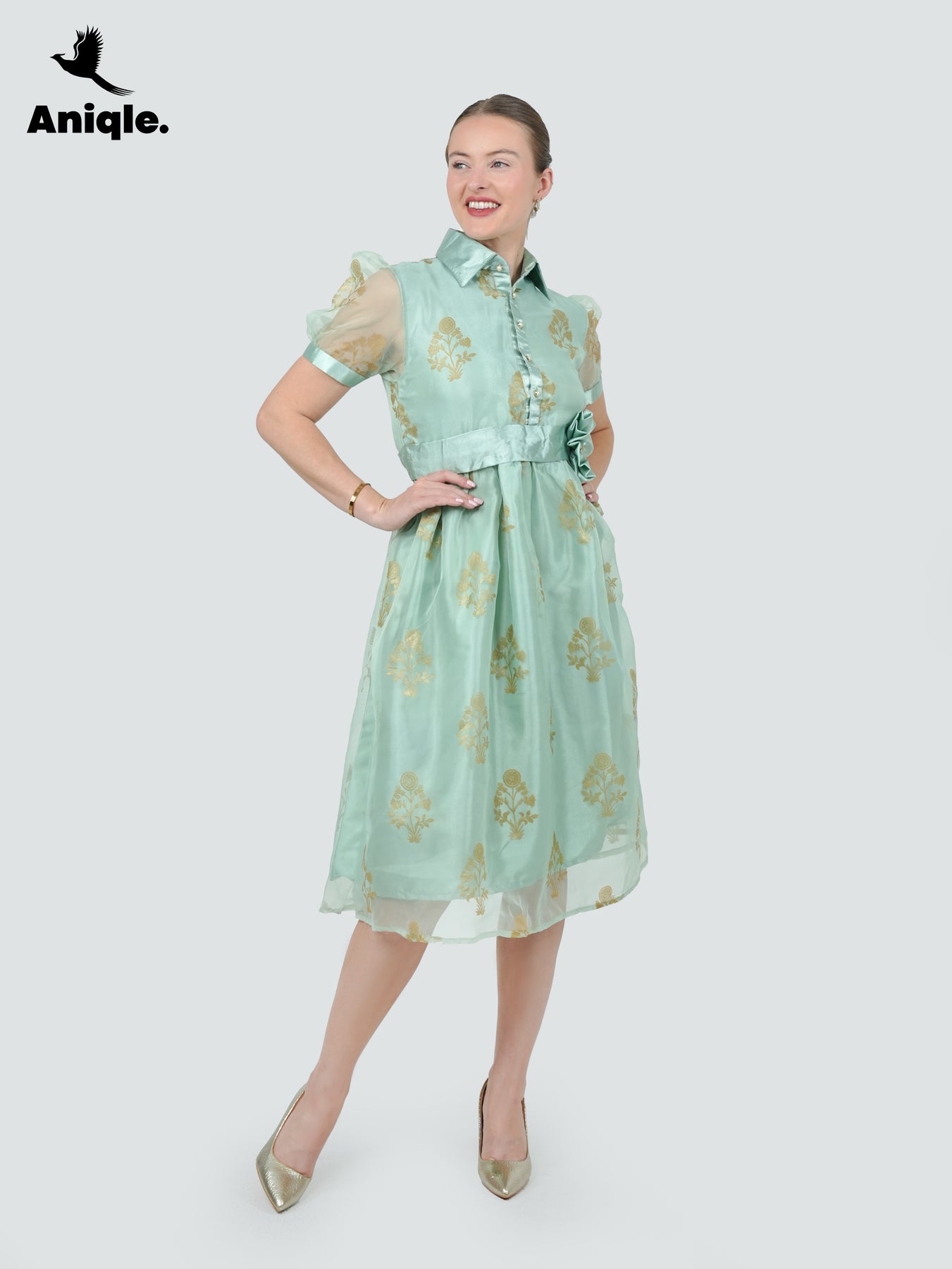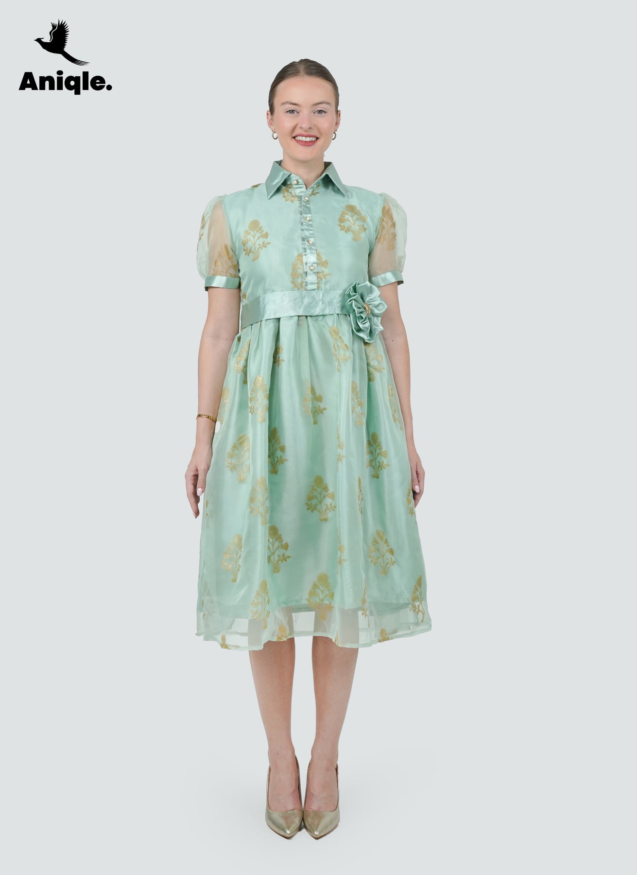 The Mint Bloom Printed Organza Dress by Aniqle is a graceful blend of softness and structure. Designed in sheer mint organza with delicate gold-toned printed motifs, it features a shirt collar, puff sleeves, and a matching belt with a floral accent. A smooth satin lining adds comfort and richness, making this midi-length dress perfect for festive occasions, day events, or garden gatherings.