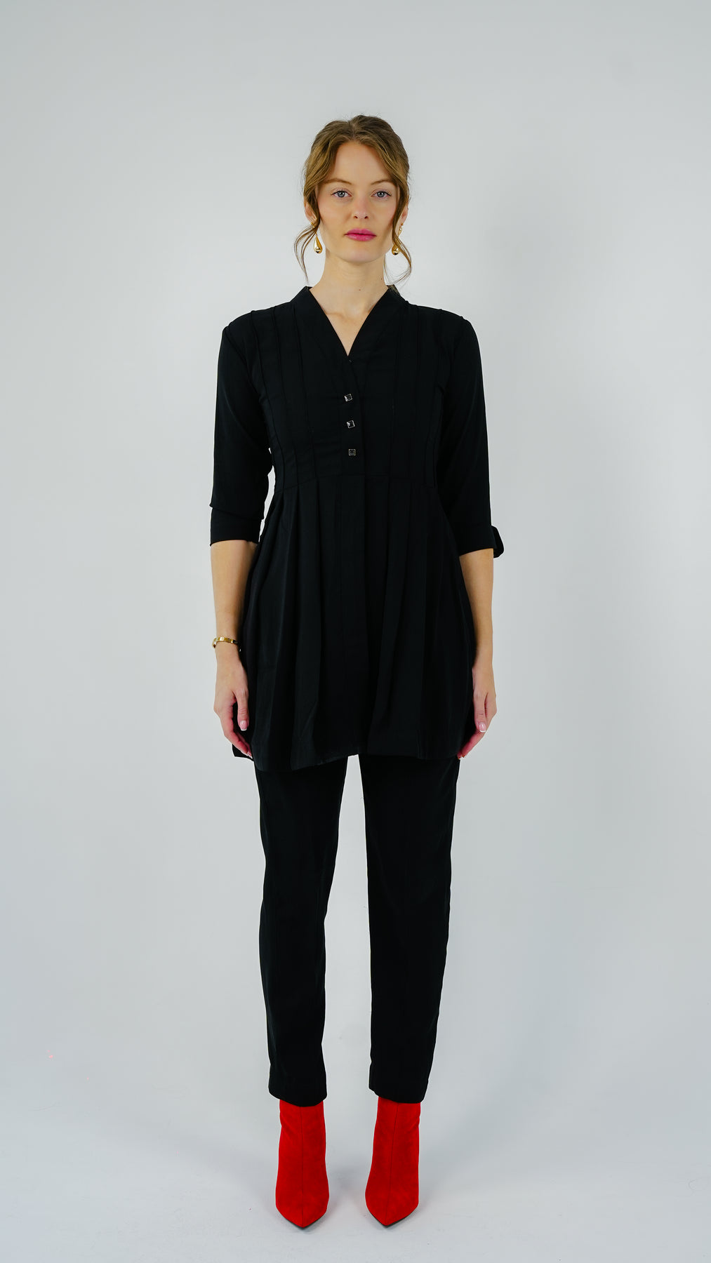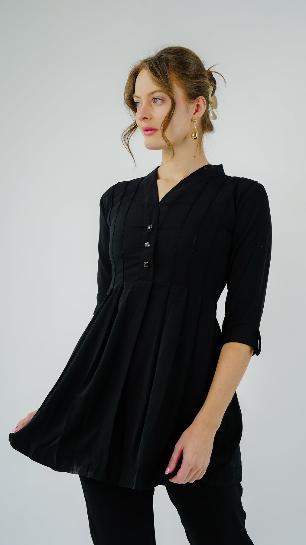 The Noir Line Pintuck Co-Ord Set by Aniqle is a timeless blend of comfort and understated tailoring. Crafted in soft black fabric, the set features a pintuck-detailed tunic top with a V-neckline, subtle button accents, and 3/4 sleeves. Paired with slim tapered trousers, this monochrome set is ideal for refined daywear, travel looks, or semi-formal affairs.
