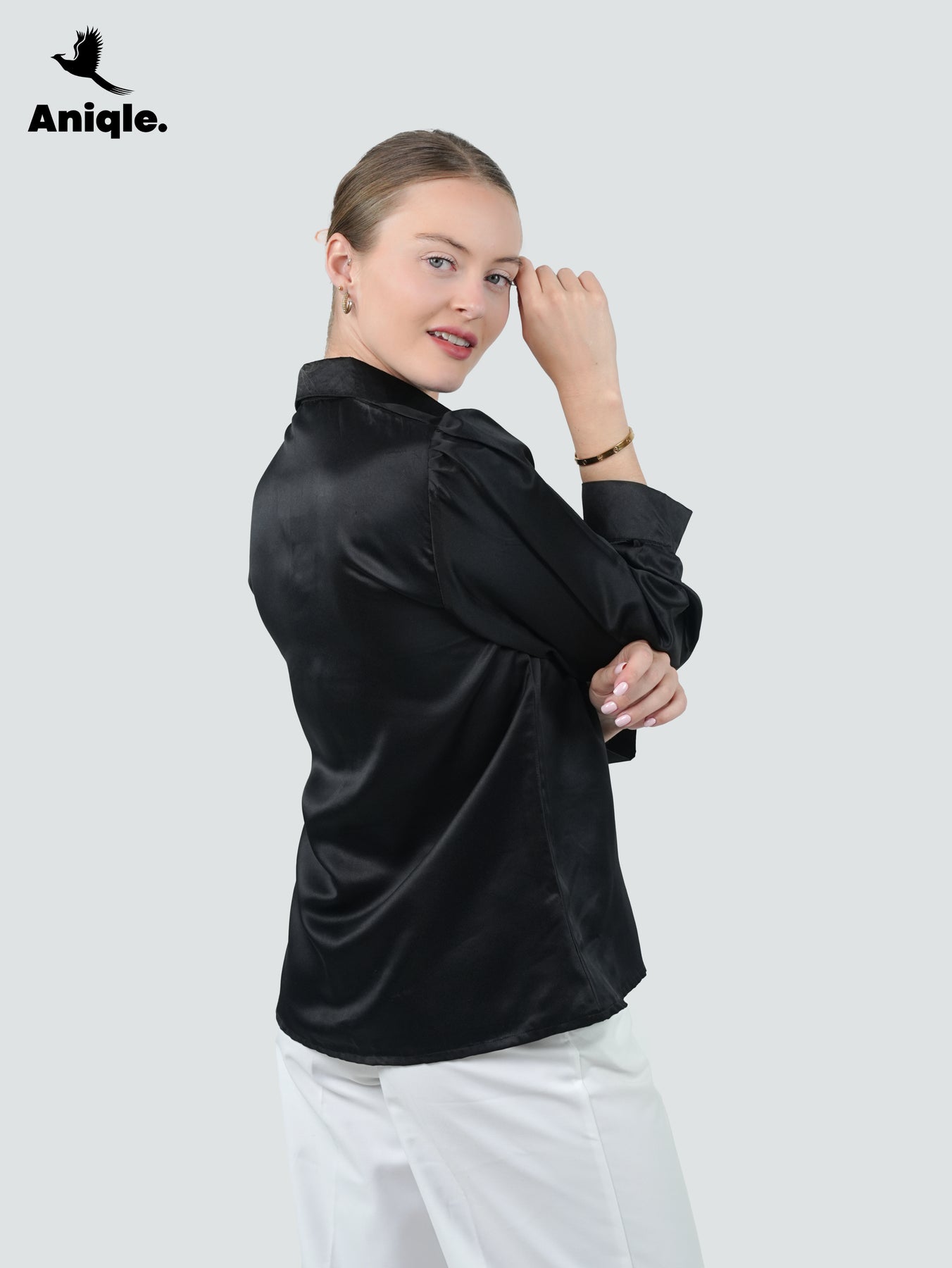 The Midnight Satin Classic Shirt by Aniqle is a timeless staple elevated in glossy black satin. Designed with a structured collar, full front buttons, and long sleeves with turned-up cuffs, it offers a polished look for day-to-evening elegance.